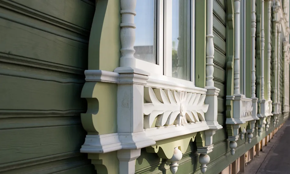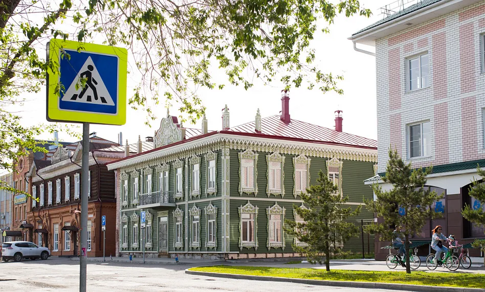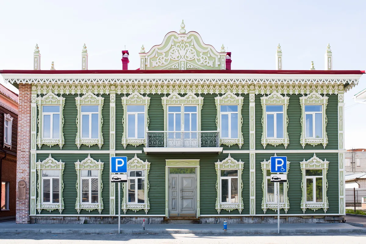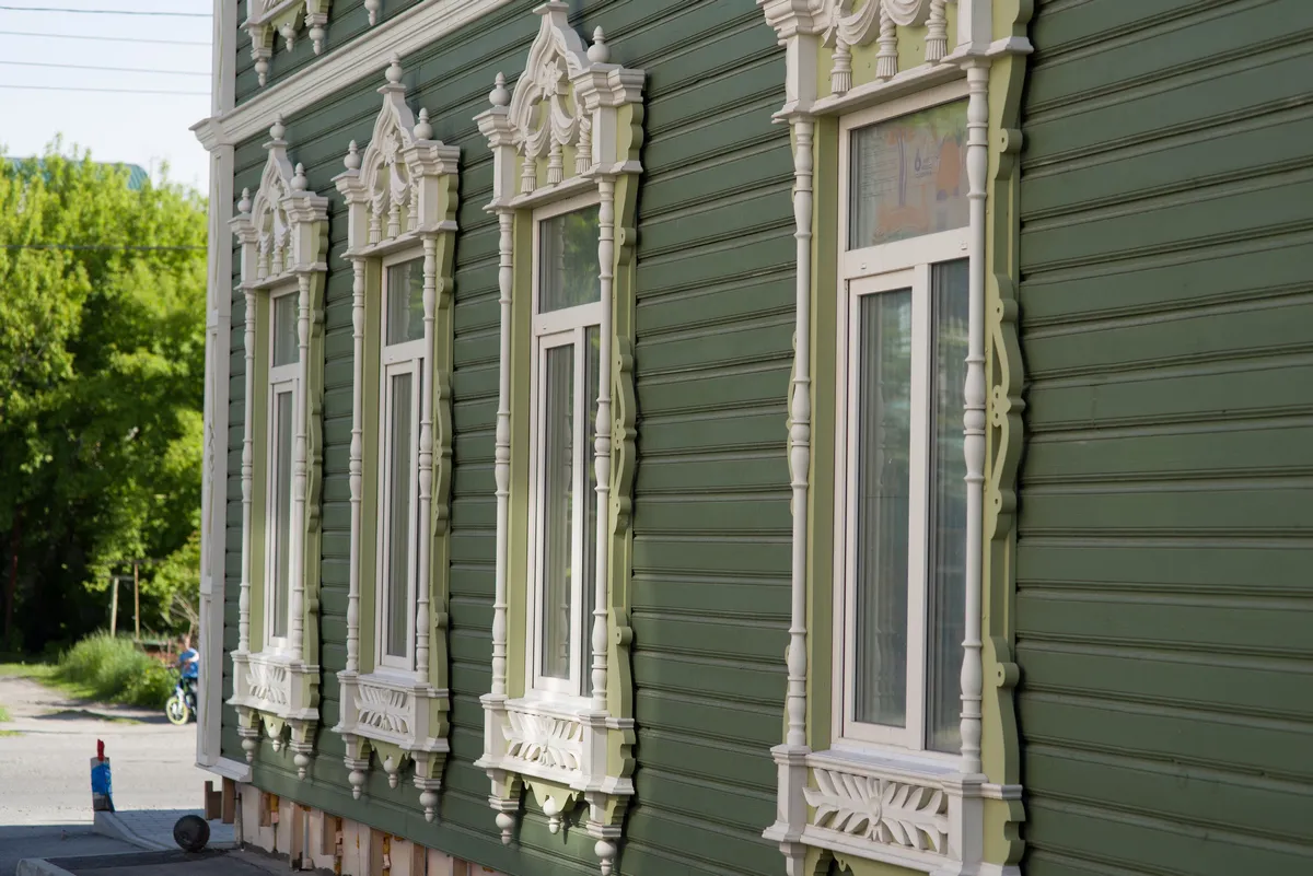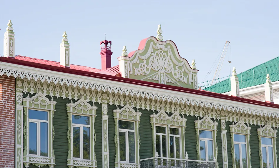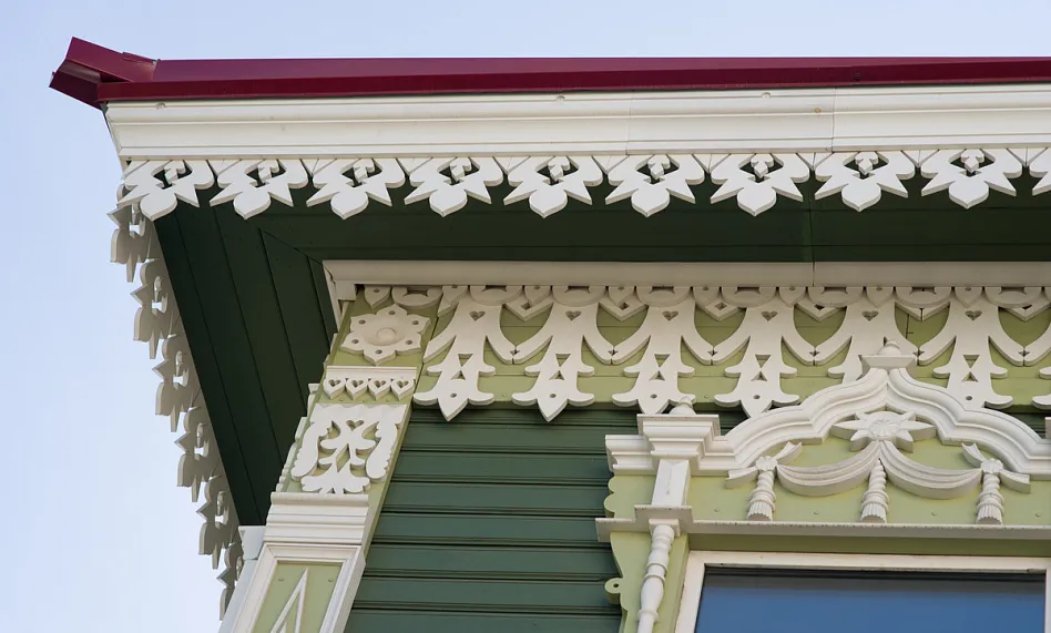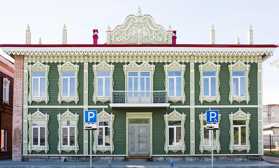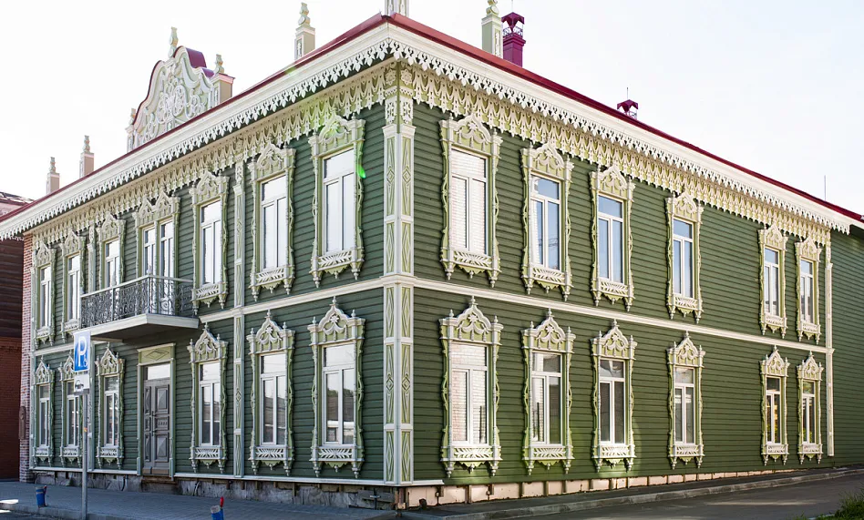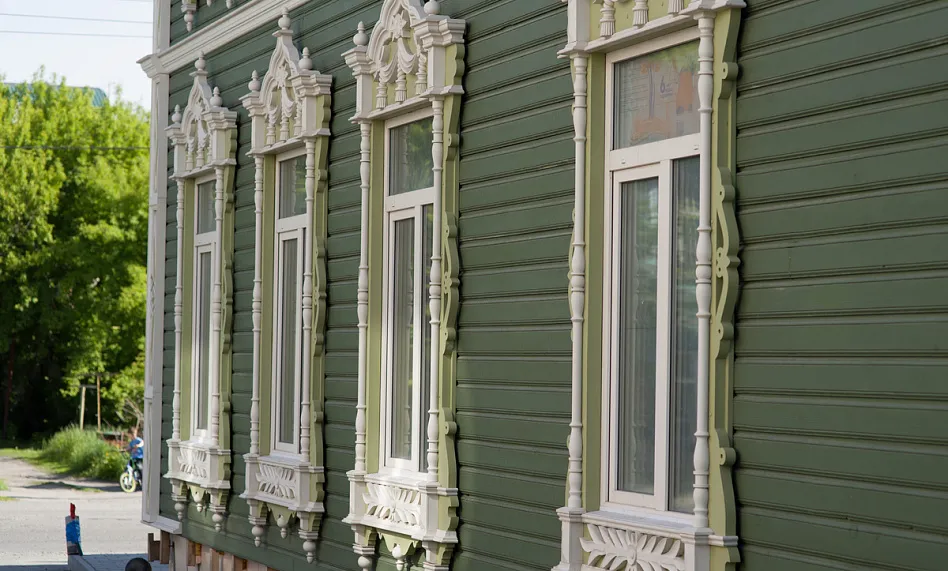 Аптека Крюгер, построенная в начале XX века– пожалуй, самый богато украшенный резьбой деревянный дом на улице Пушкина. Оконные наличники украшены оригинальными резными узорами в виде звезд, гирлянд с кистями и листьями. Внутри дома сохранен первоначальный интерьер начала XX века с резным деревянным потолком и карнизом.