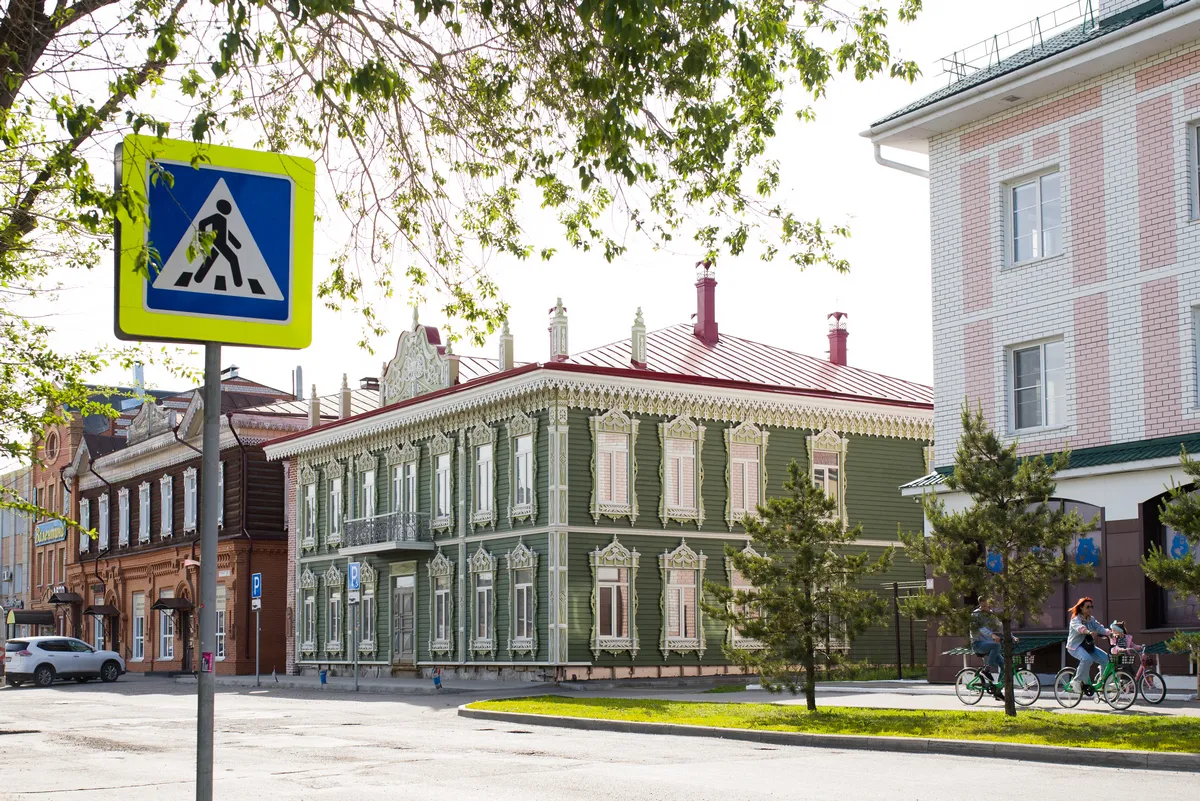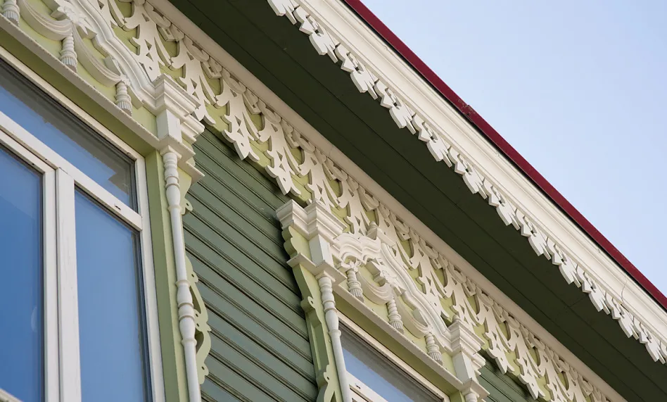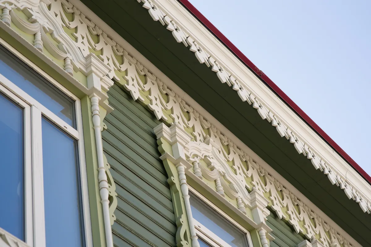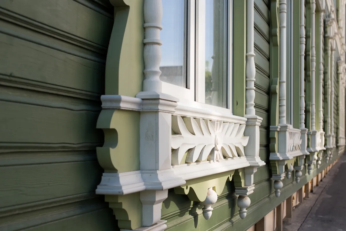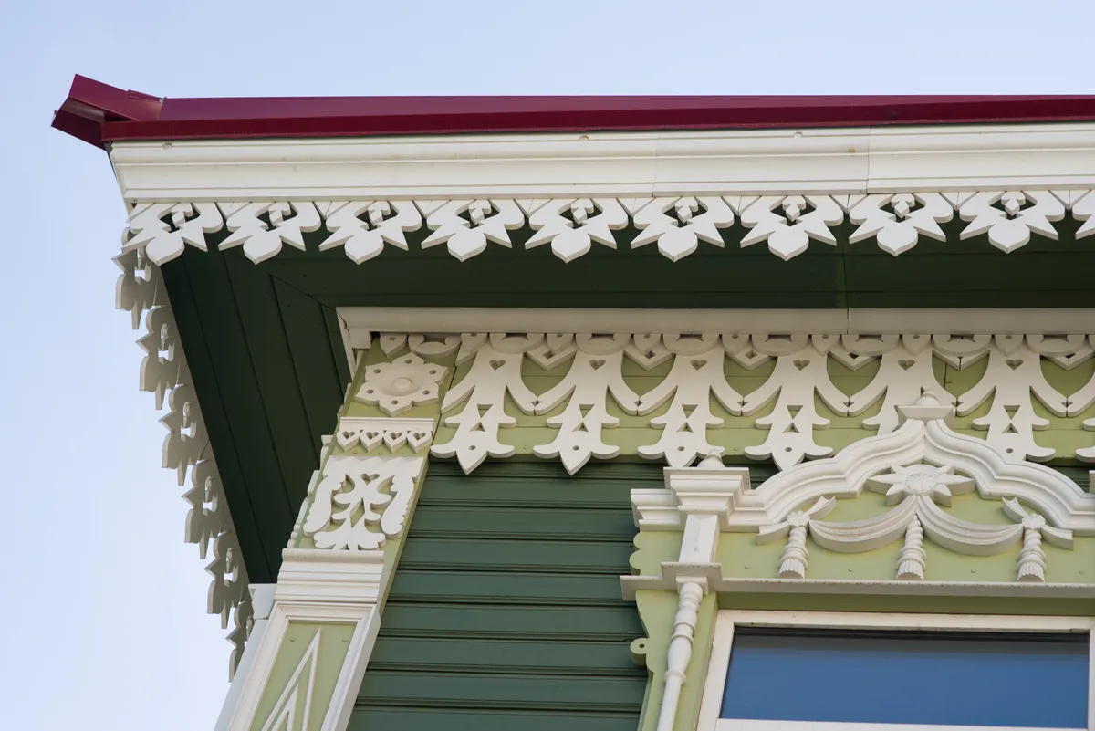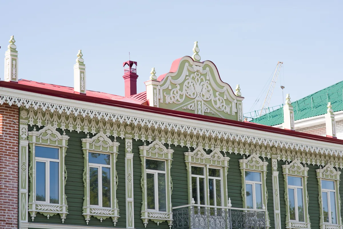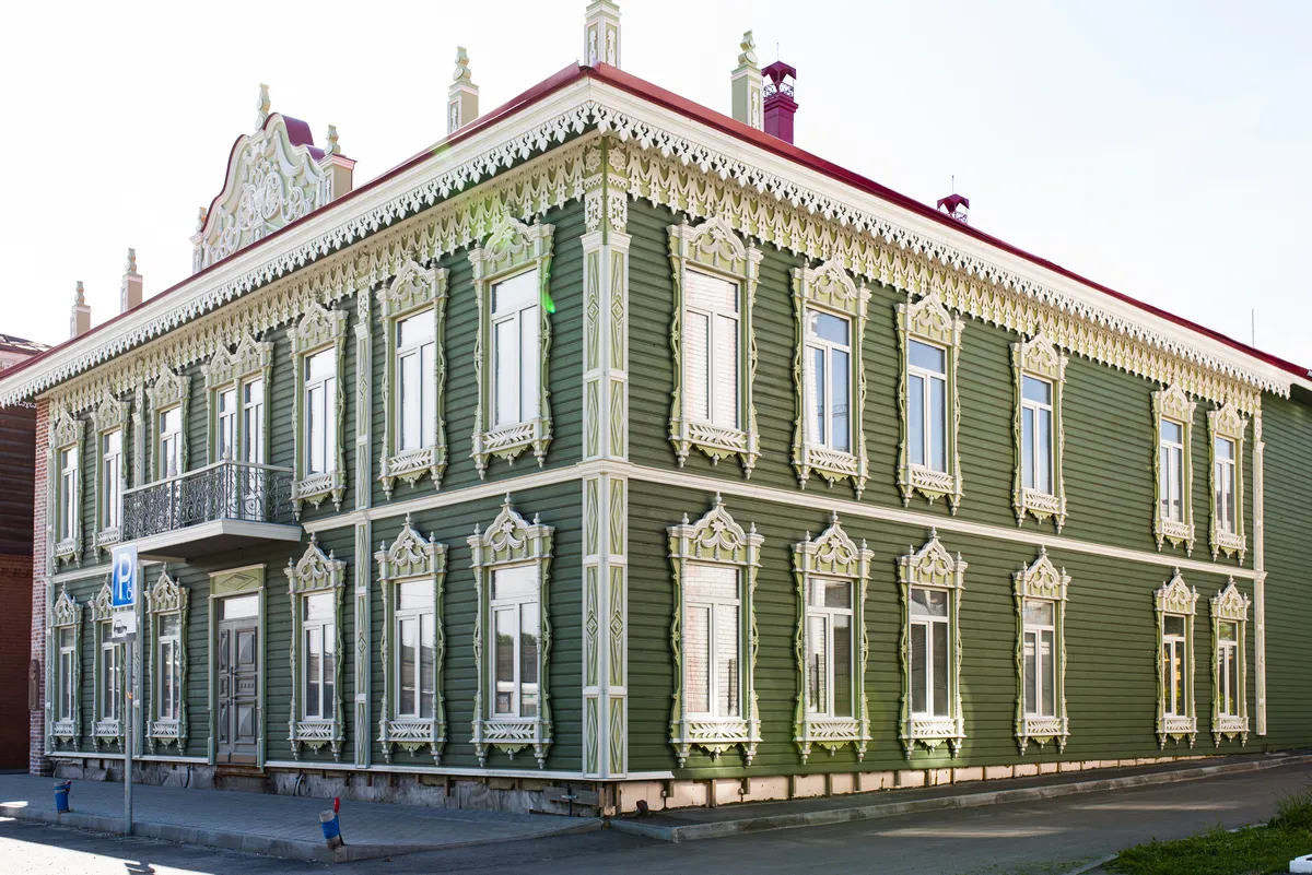 Аптека Крюгер, построенная в начале XX века– пожалуй, самый богато украшенный резьбой деревянный дом на улице Пушкина. Оконные наличники украшены оригинальными резными узорами в виде звезд, гирлянд с кистями и листьями. Внутри дома сохранен первоначальный интерьер начала XX века с резным деревянным потолком и карнизом.