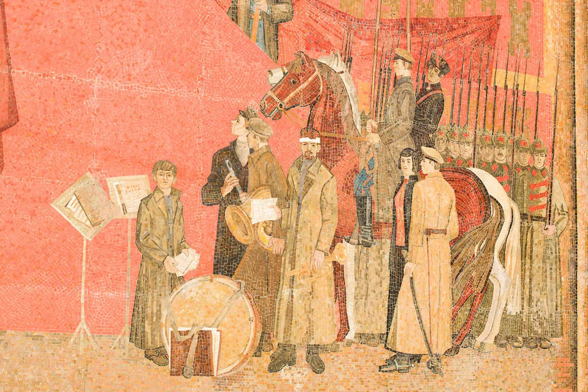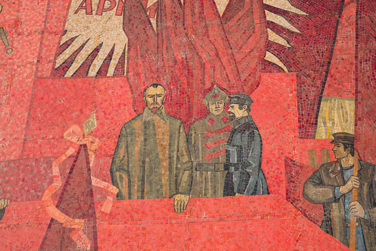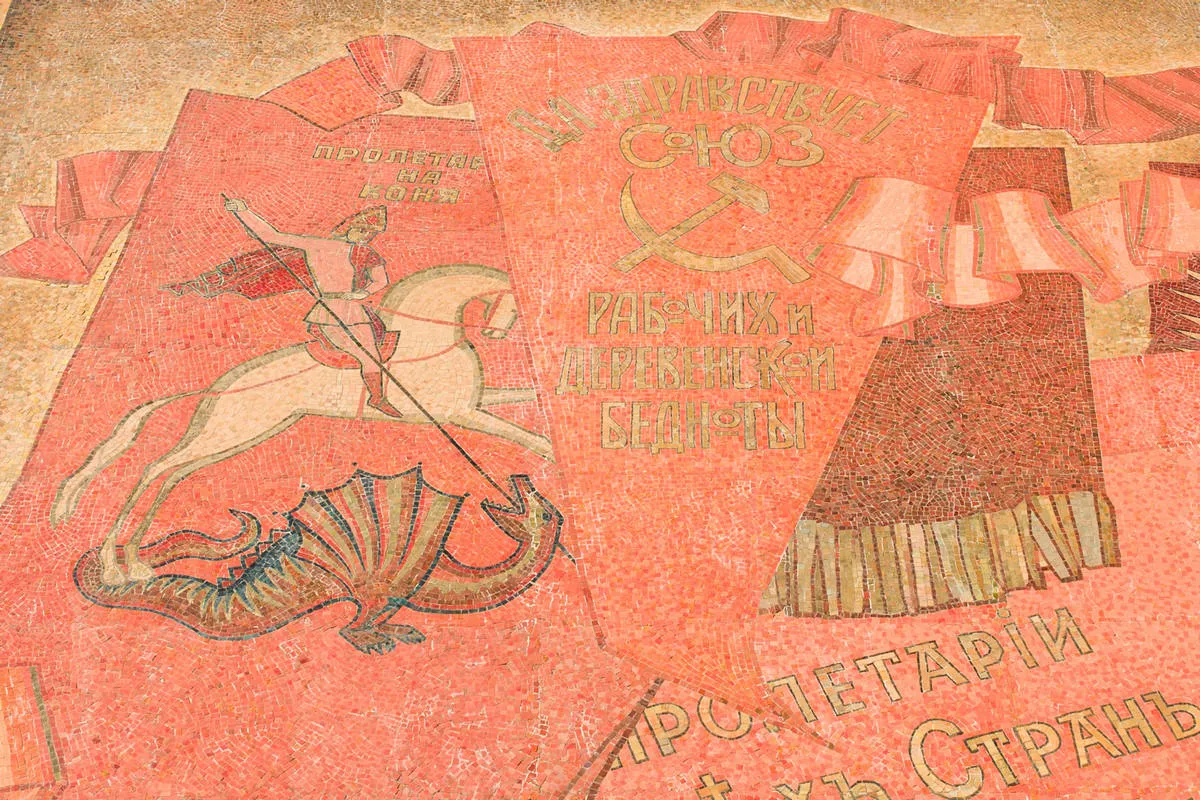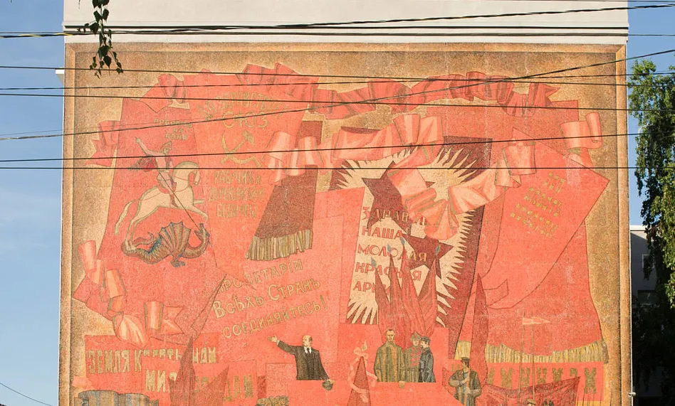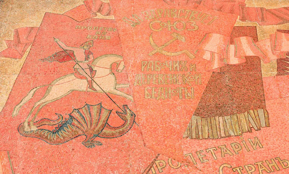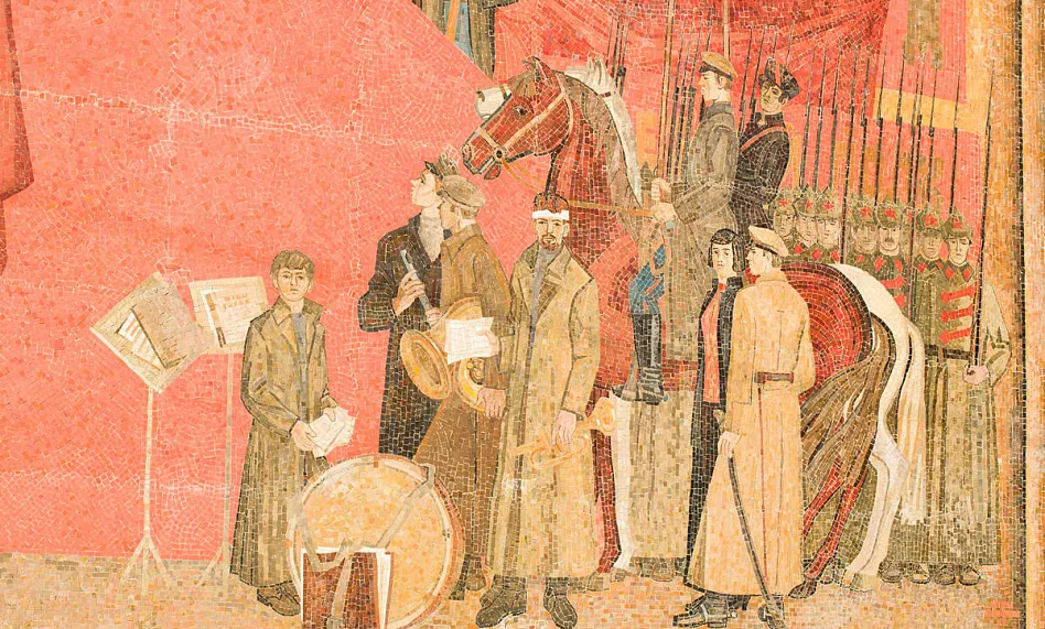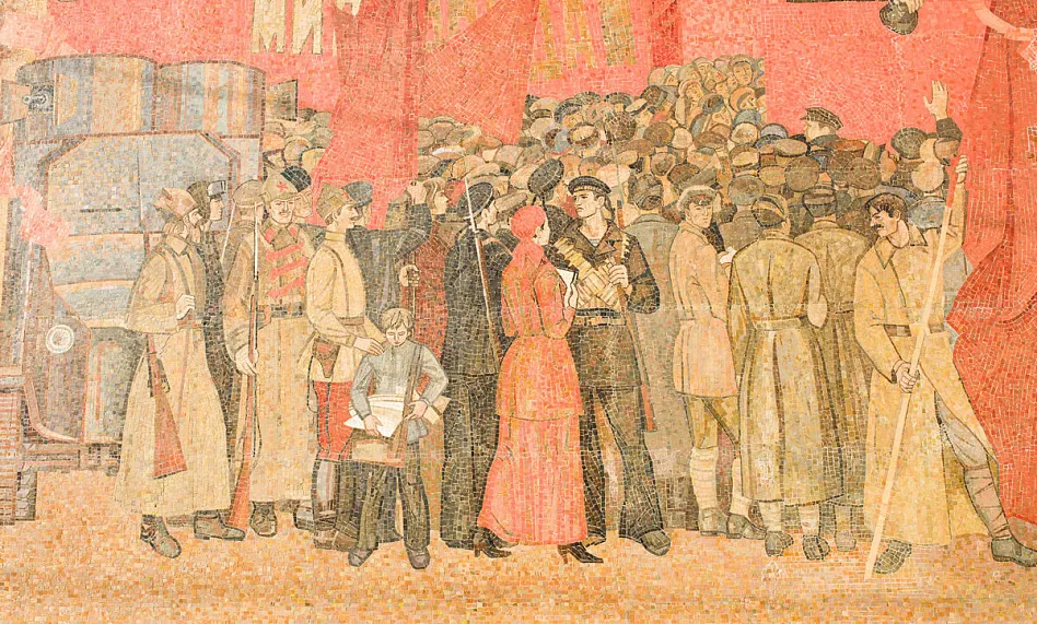 Яркая, многообразная и стильная мозаика -«Знамя революции» появилась в 1983 году и сразу стала одной из самых примечательных на проспектеЛенина.