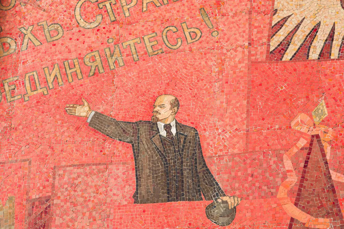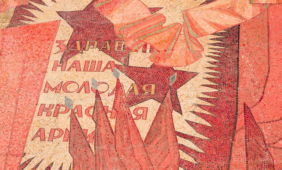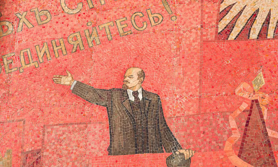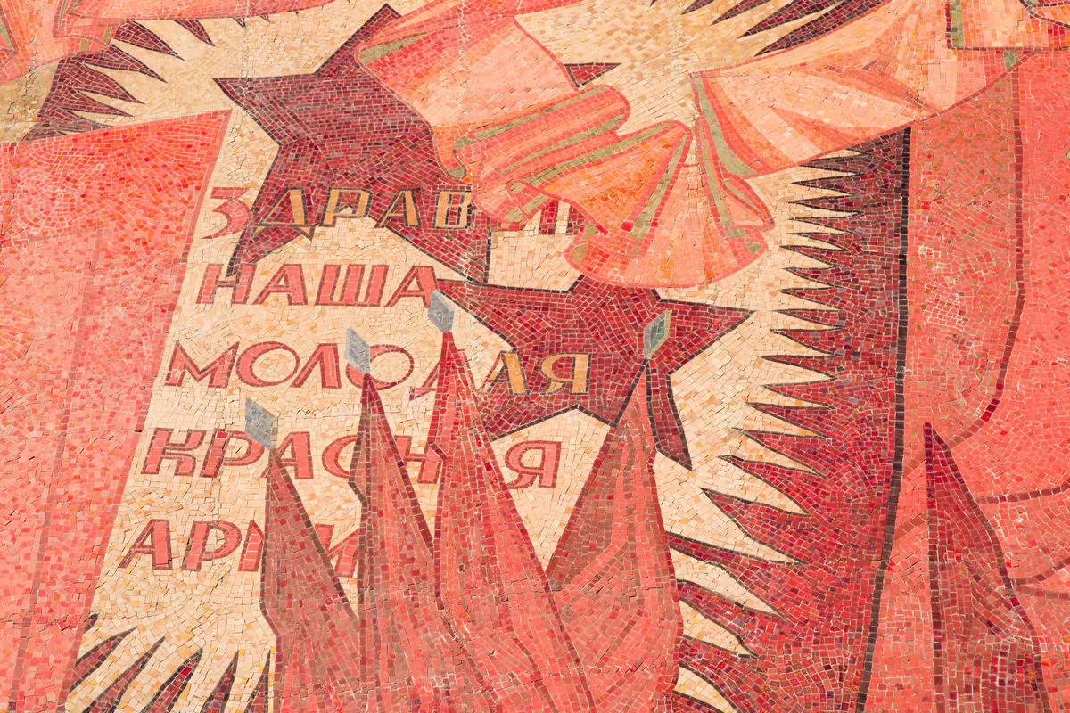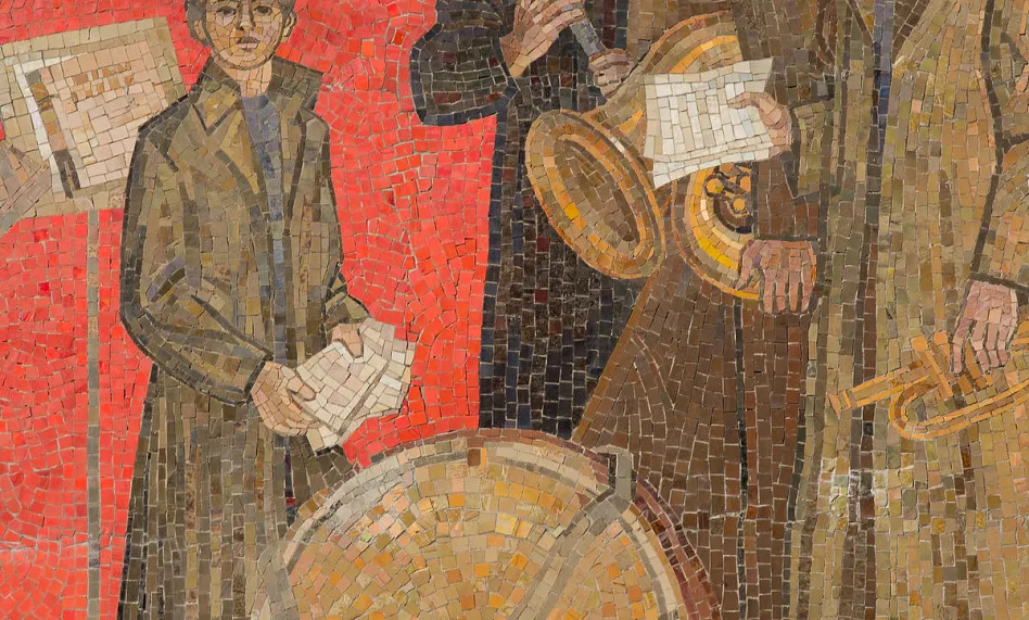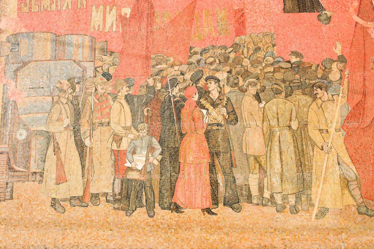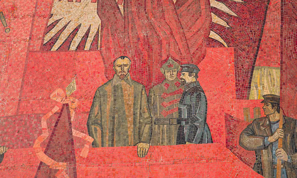 Яркая, многообразная и стильная мозаика -«Знамя революции» появилась в 1983 году и сразу стала одной из самых примечательных на проспектеЛенина.