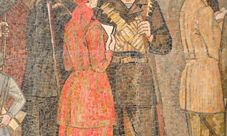 Сюжет мозаики, а также техника ее исполнения создают особую игру света и тени. Благодаря этому панно постоянно меняется и в зависимости от освещения на первый план каждый раз выступает новая деталь.